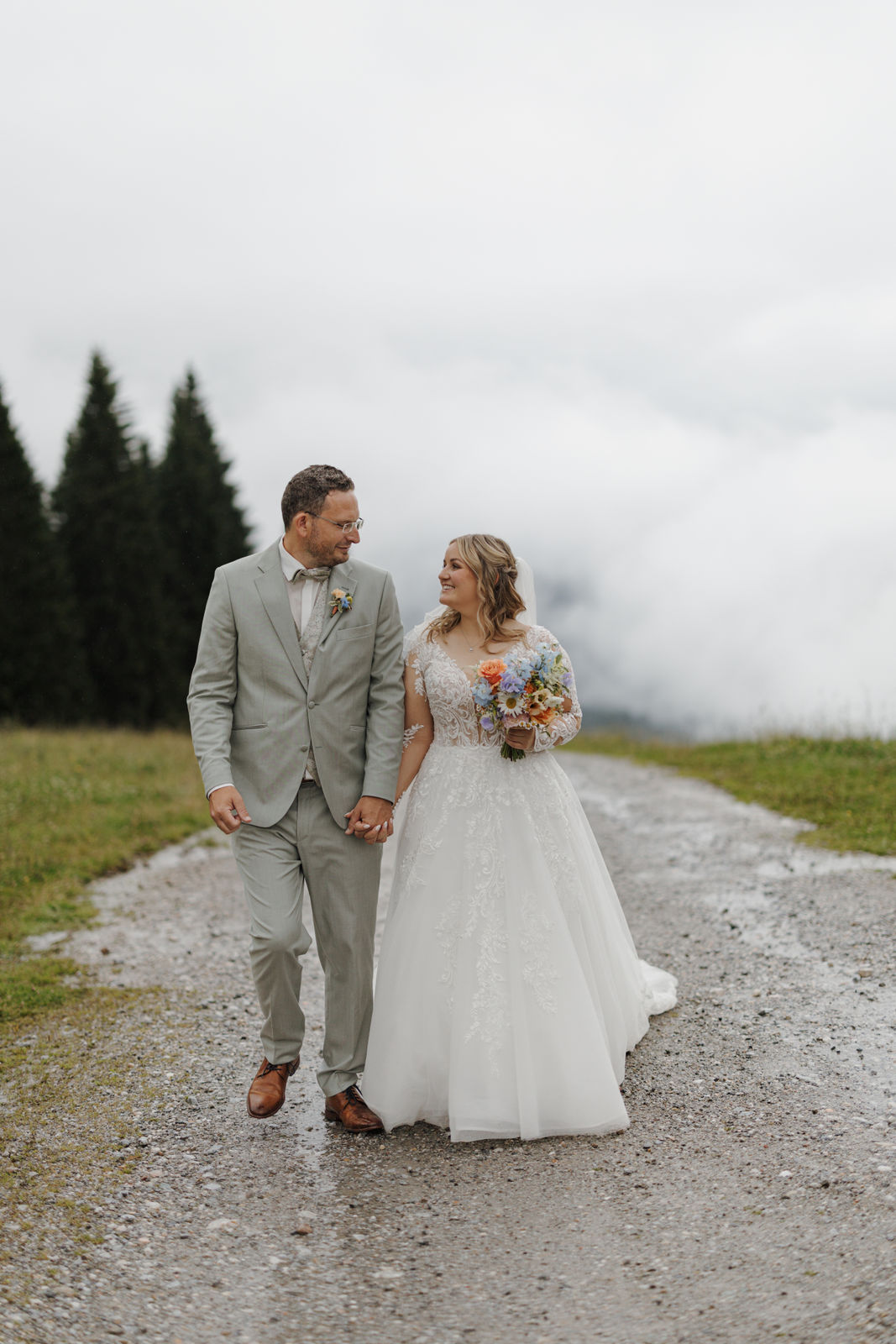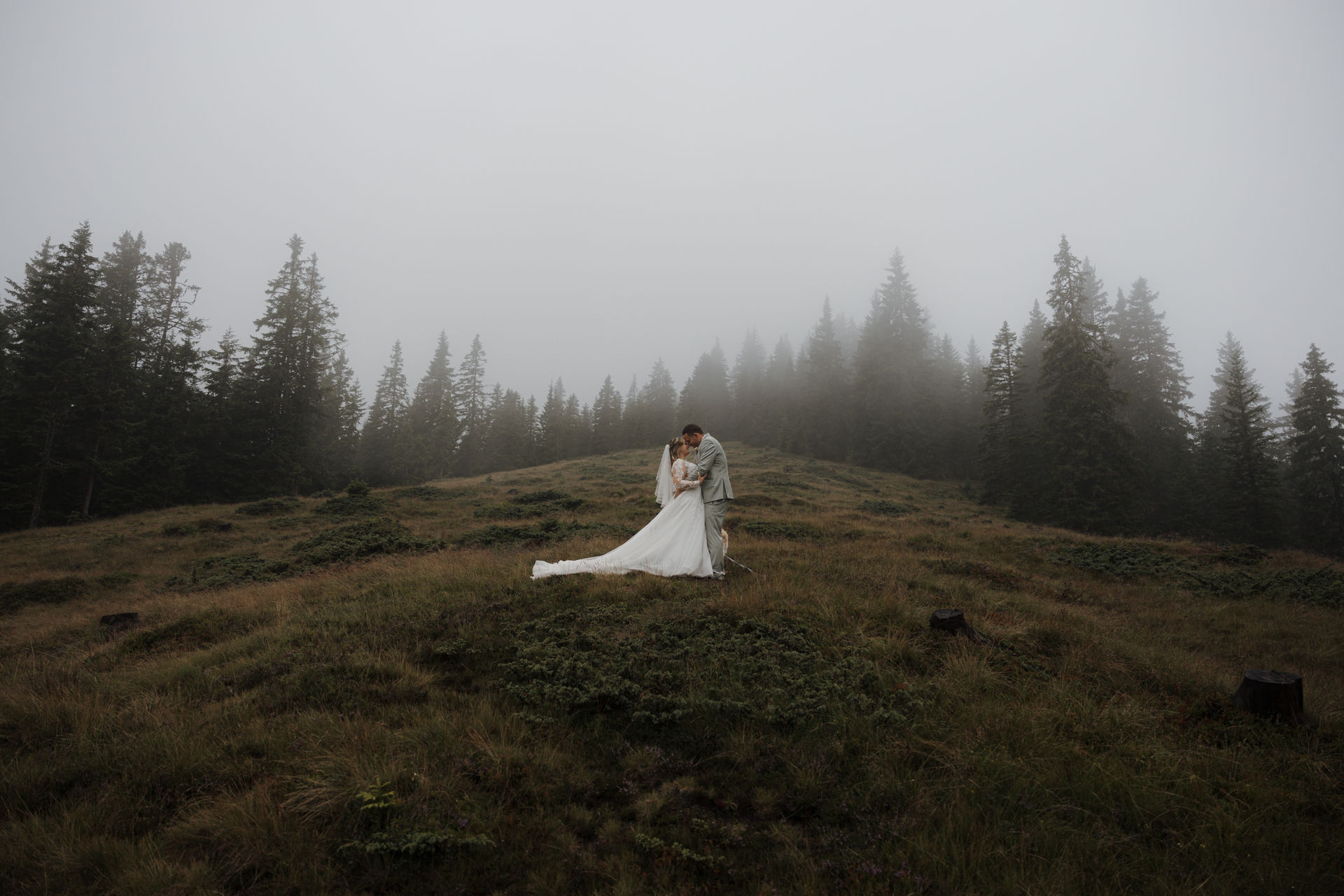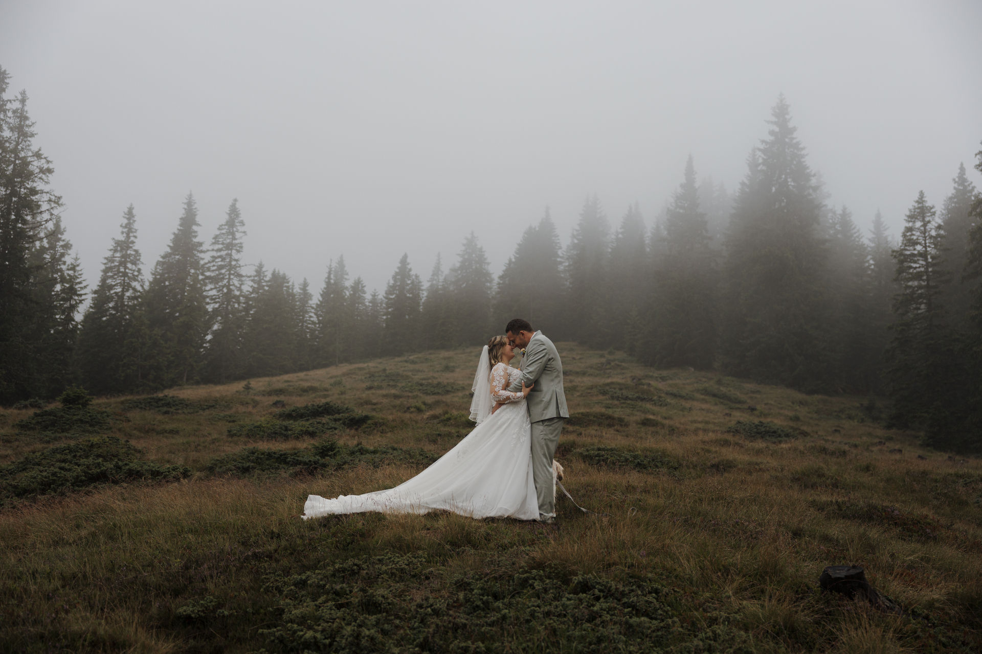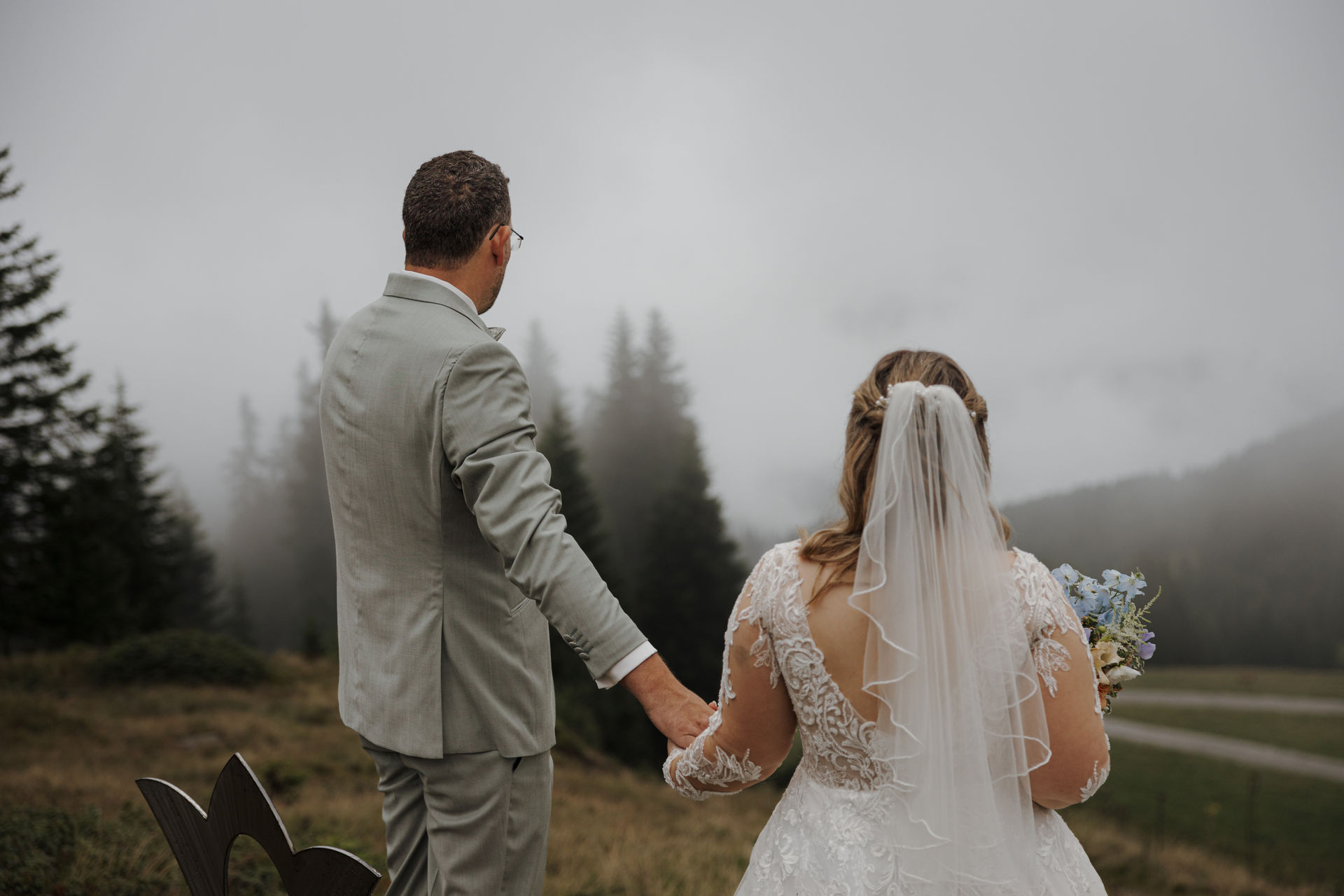 The civil wedding took place right on the mountain and felt like a free ceremony: personal, touching, and full of love. Although the weather didn't fully cooperate, it was precisely that which gave the day a special mystical atmosphere – clouds, fog, and the mountain backdrop created a truly goosebump-inducing feeling.
