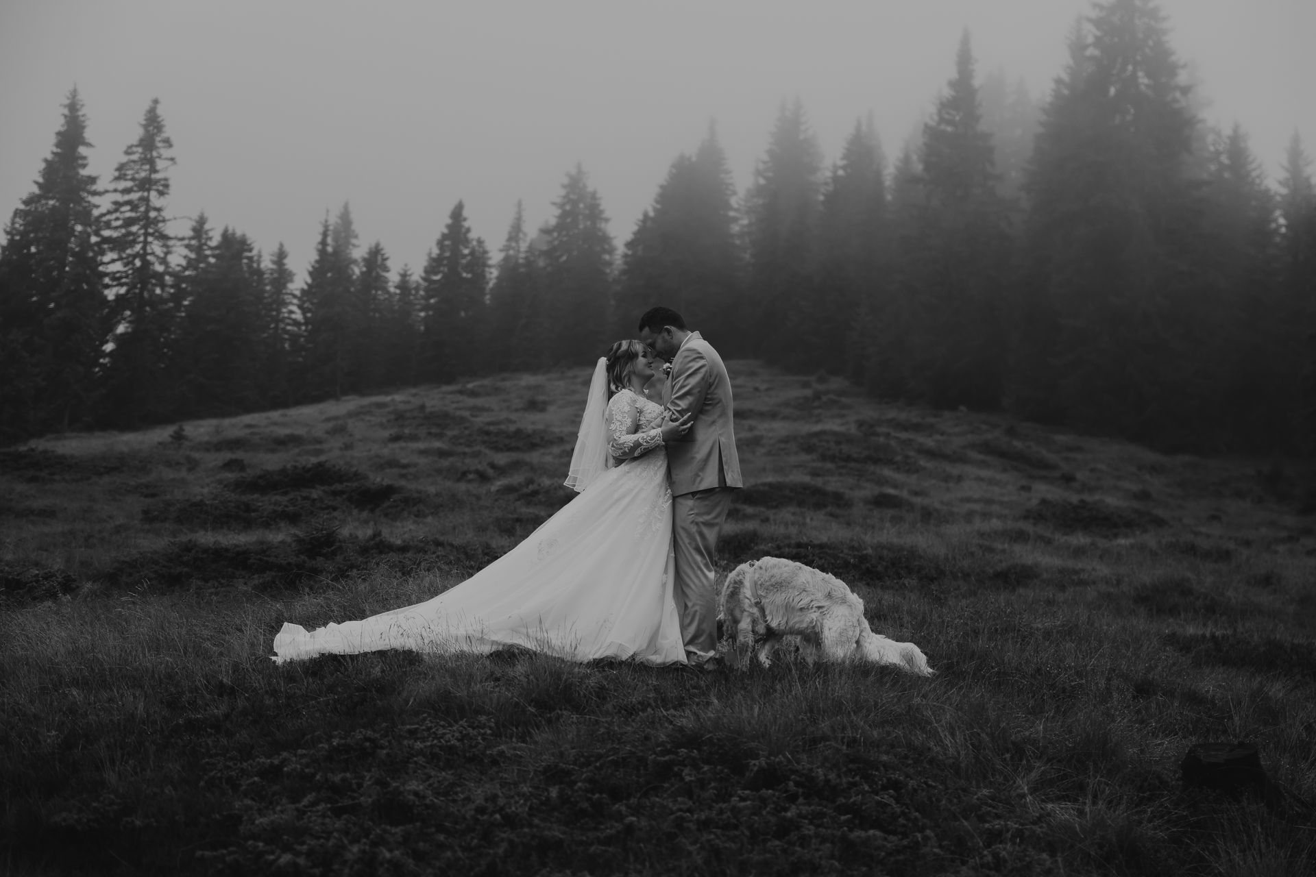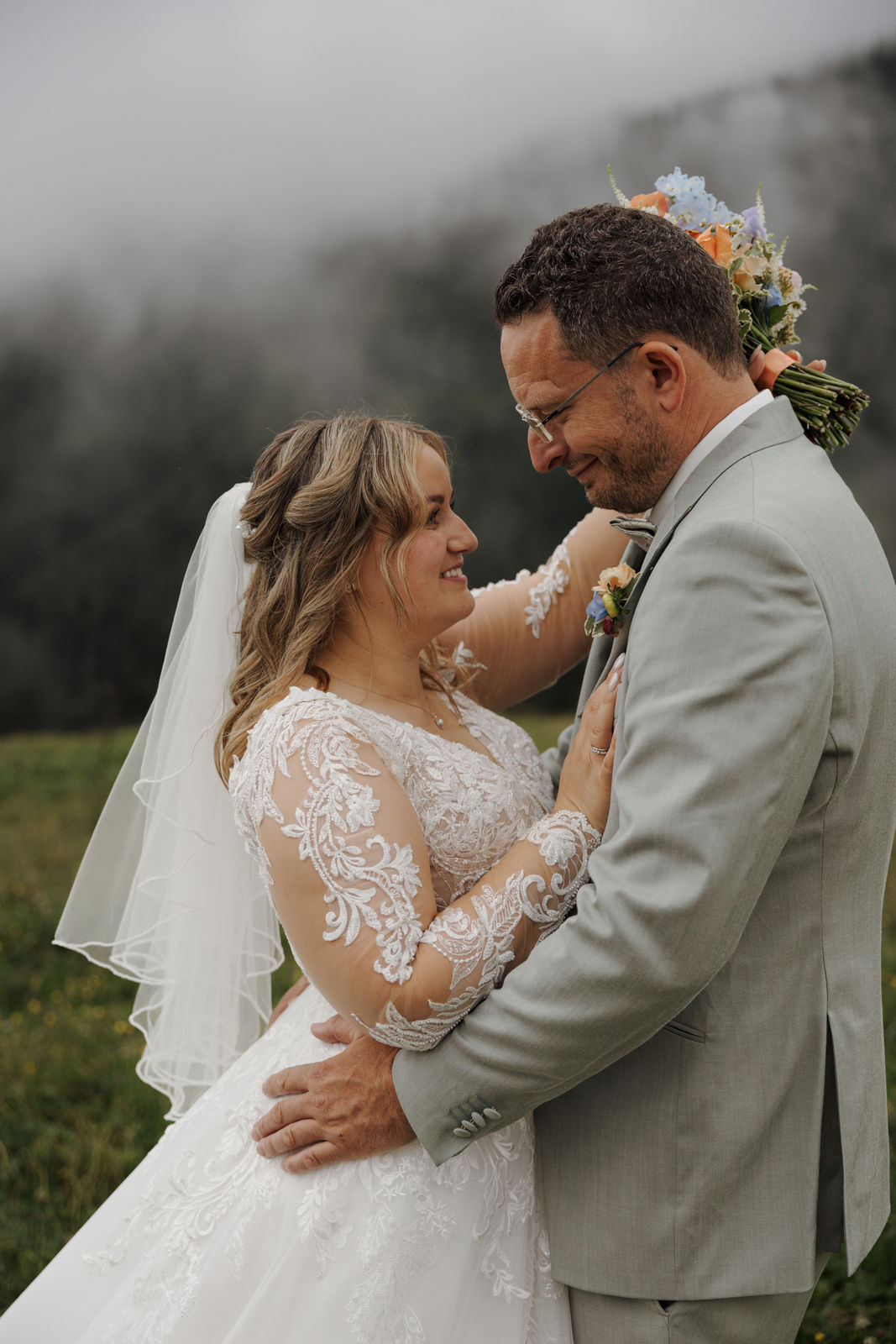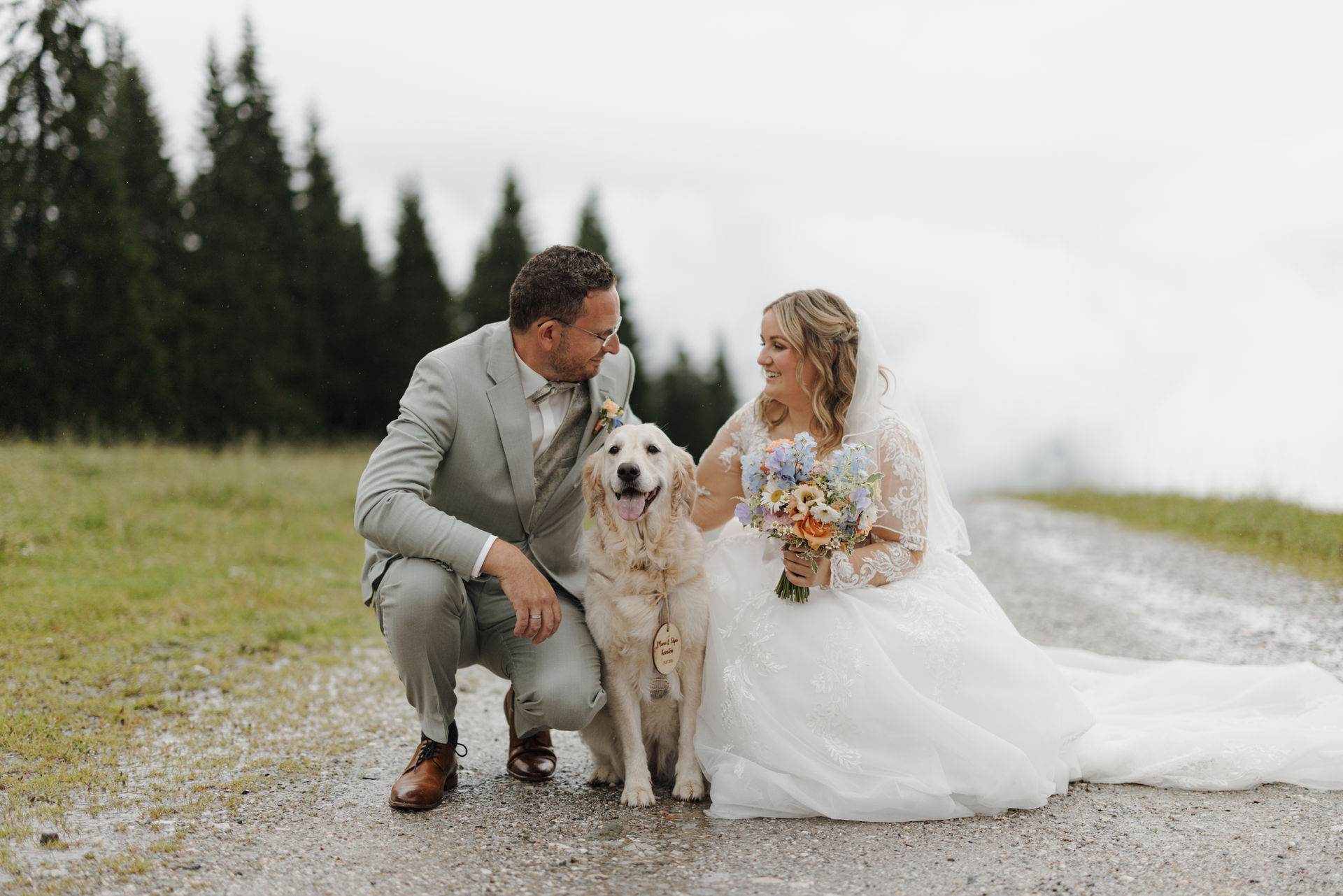 The civil wedding took place right on the mountain and felt like a free ceremony: personal, touching, and full of love. Although the weather didn't fully cooperate, it was precisely that which gave the day a special mystical atmosphere – clouds, fog, and the mountain backdrop created a truly goosebump-inducing feeling.