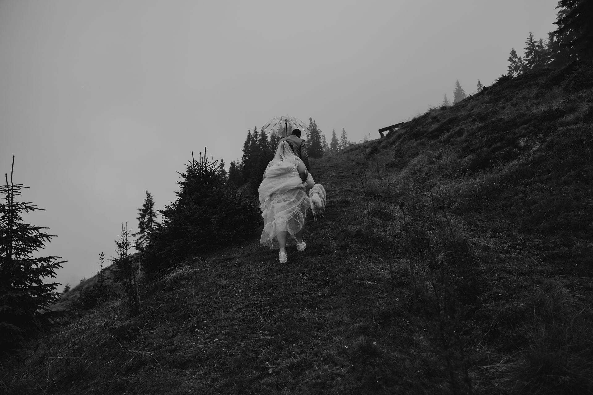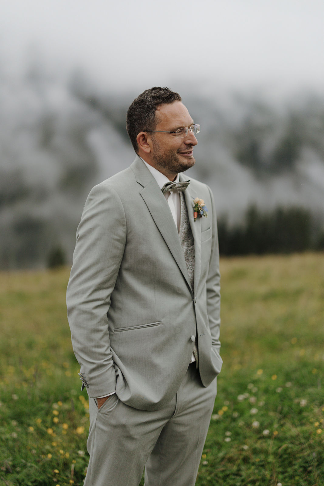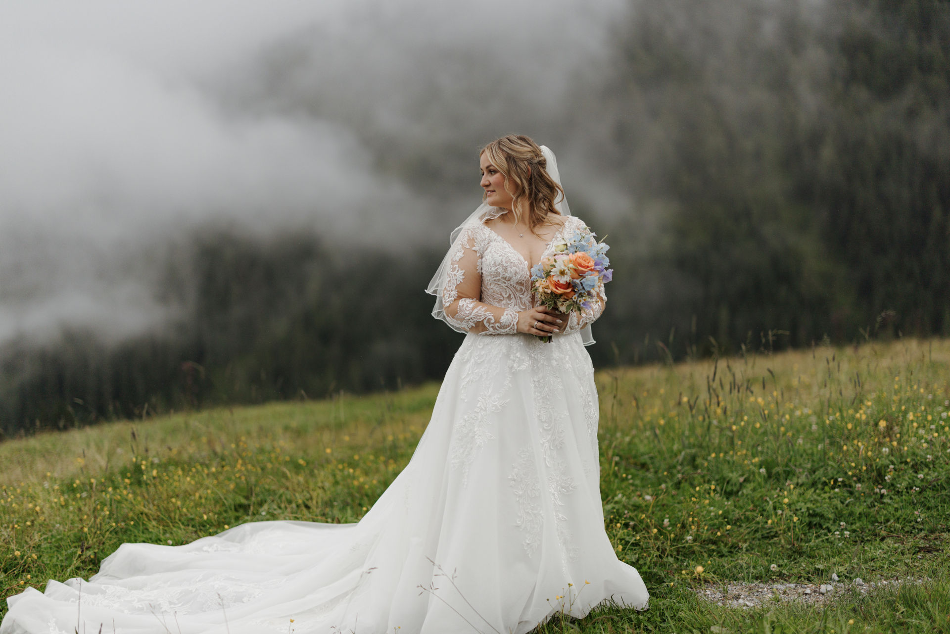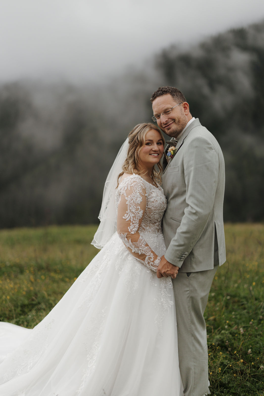 The civil wedding took place right on the mountain and felt like a free ceremony: personal, touching, and full of love. Although the weather didn't fully cooperate, it was precisely that which gave the day a special mystical atmosphere – clouds, fog, and the mountain backdrop created a truly goosebump-inducing feeling.