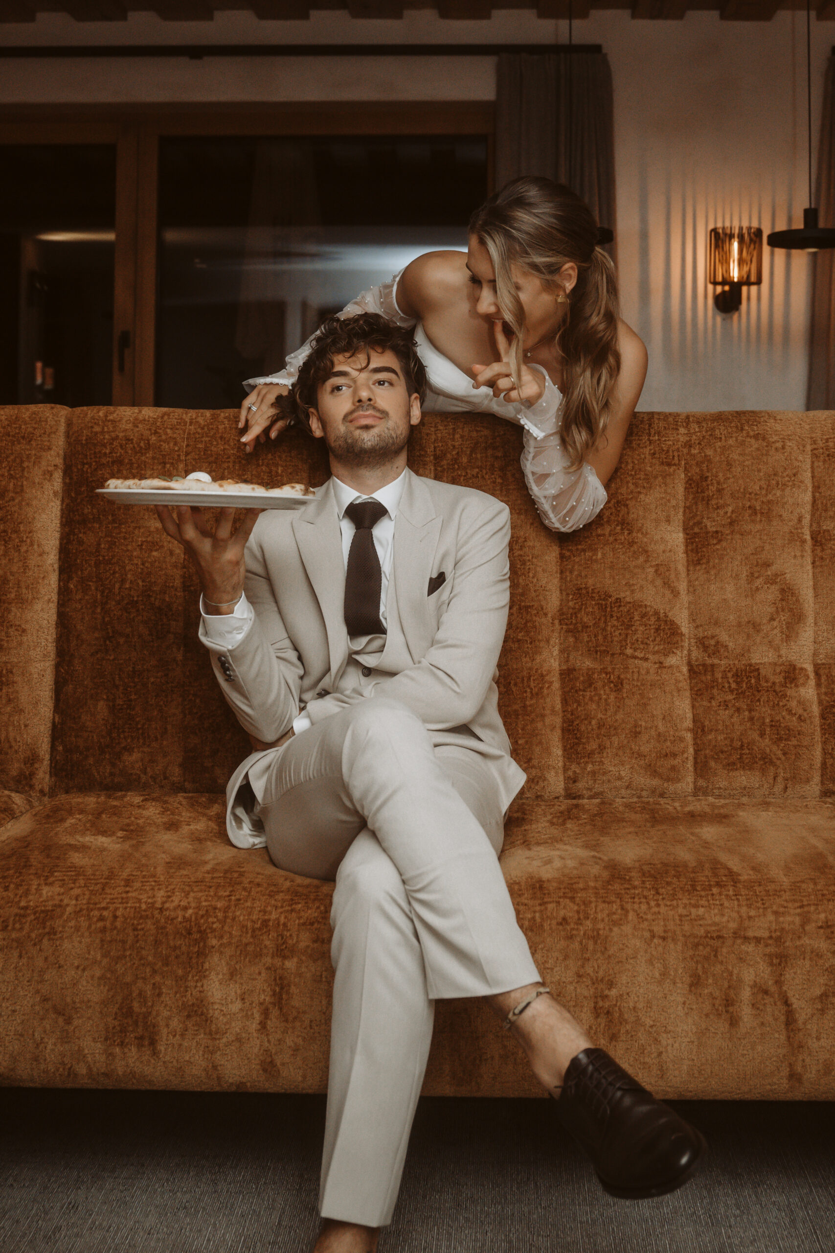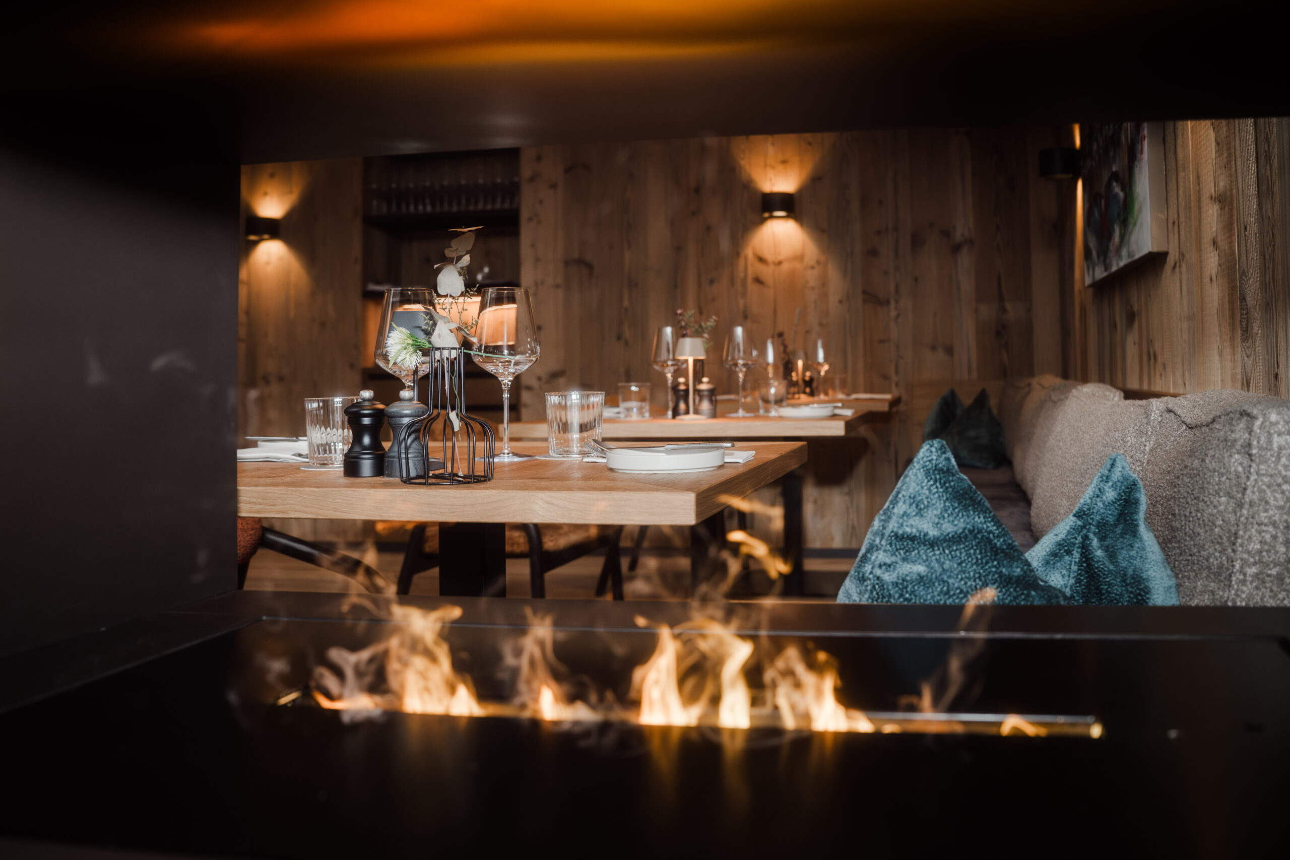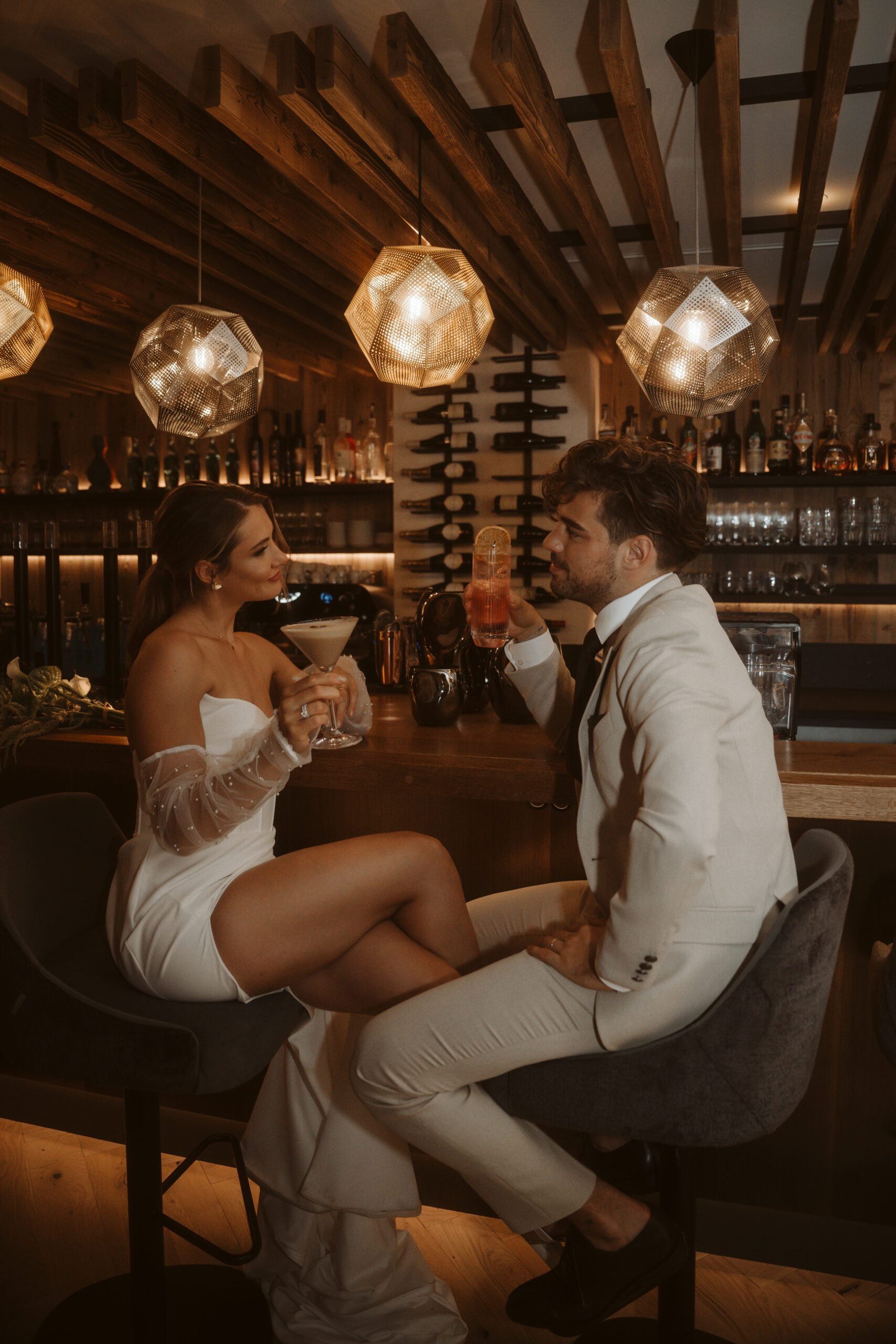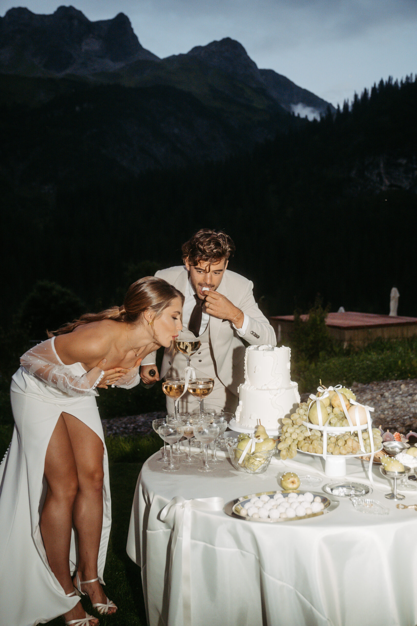 With cool and modern details, such as a special food table, pizza & cocktails at the bar and an elegant look for the bride and groom, nothing stands in the way of a modern main wedding party in the mountains of Lech.